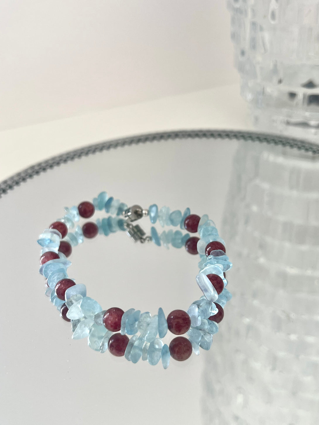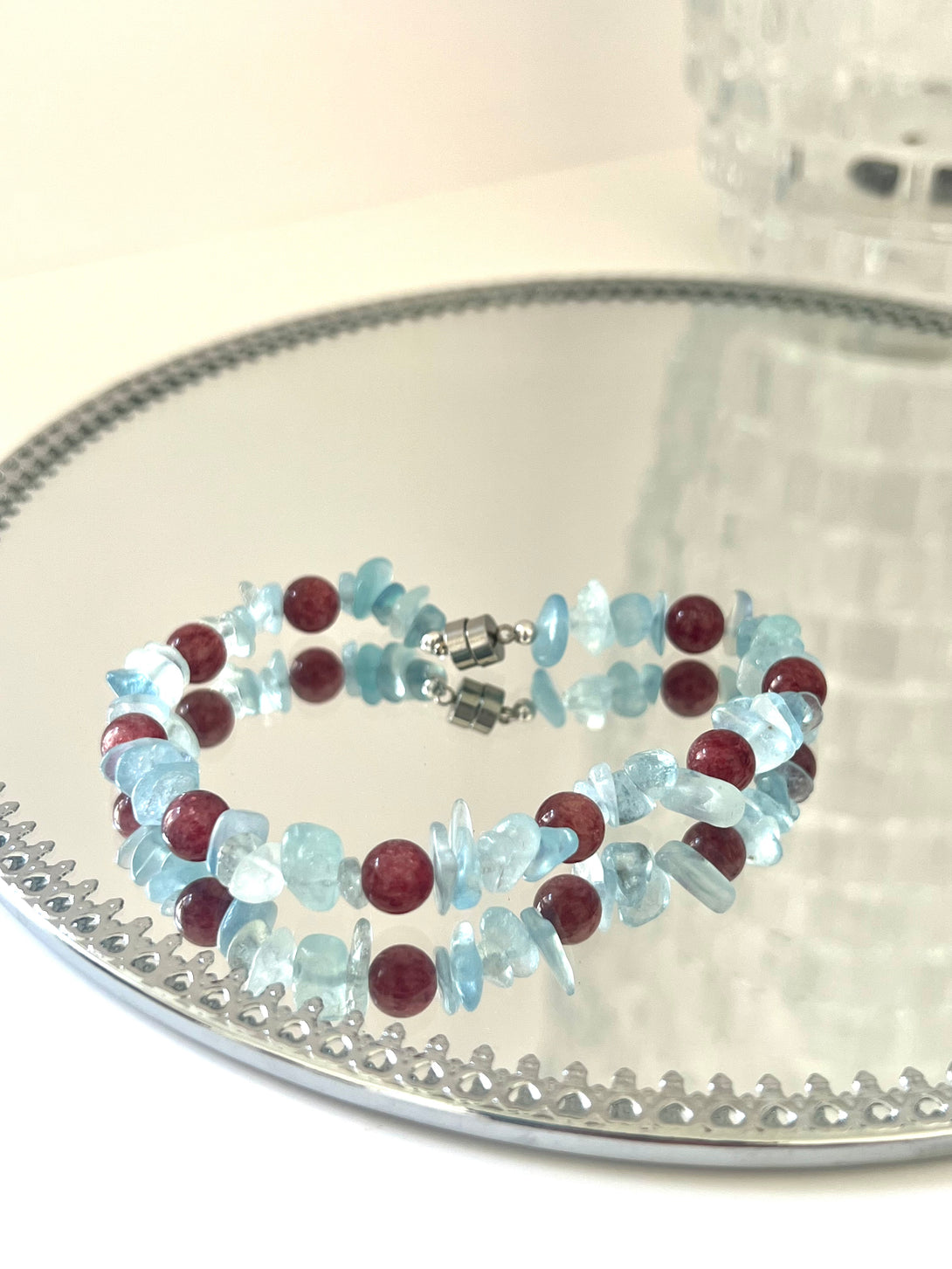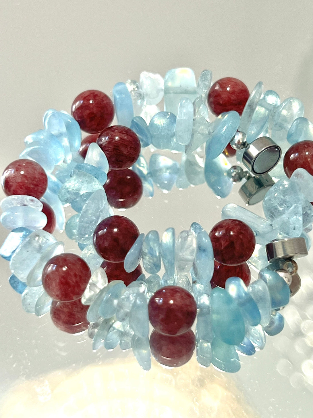 💙✨ Carry serenity and love wherever you go. This bracelet combines Aquamarine, the stone of courage and calm seas, with Strawberry Quartz, the crystal of love and joy. Together they balance the Throat Chakra and Heart Chakra, guiding you to speak your truth with compassion. Perfect for Pisces, Aquarius, Gemini, Libra, and Taurus ✨🌊🍓