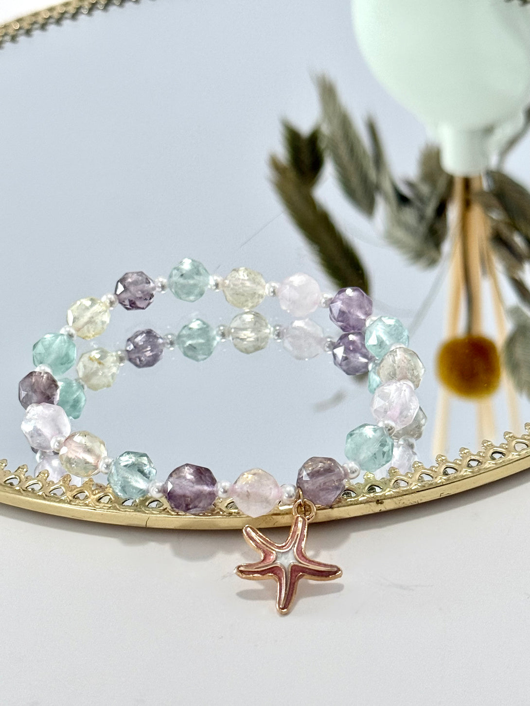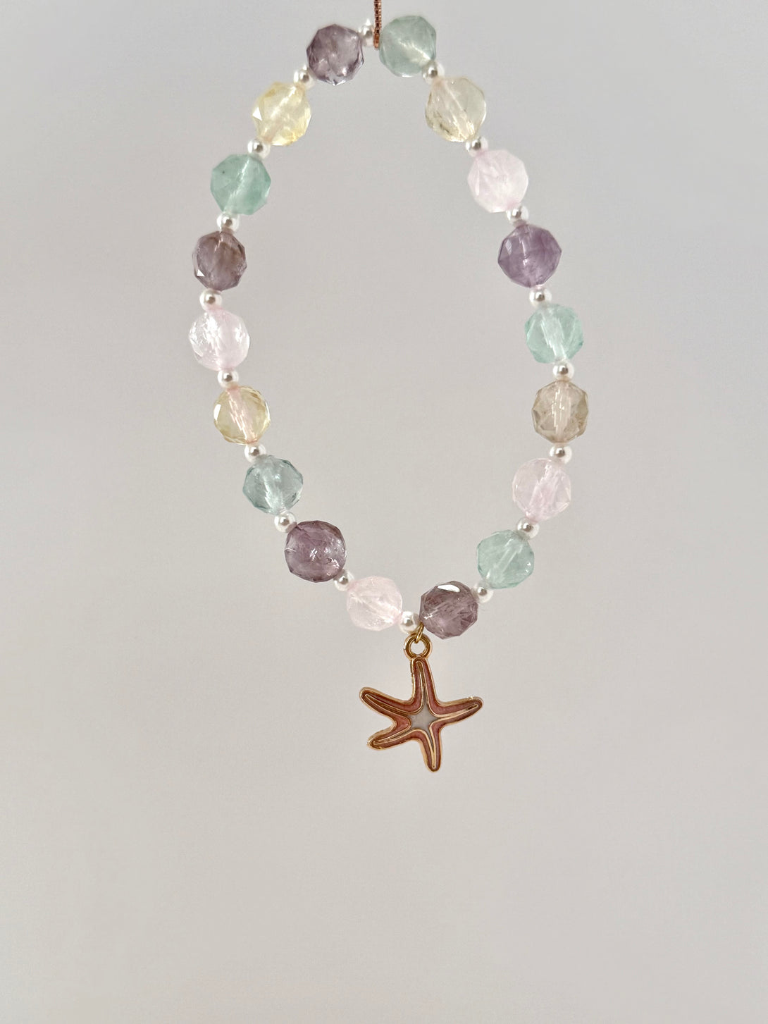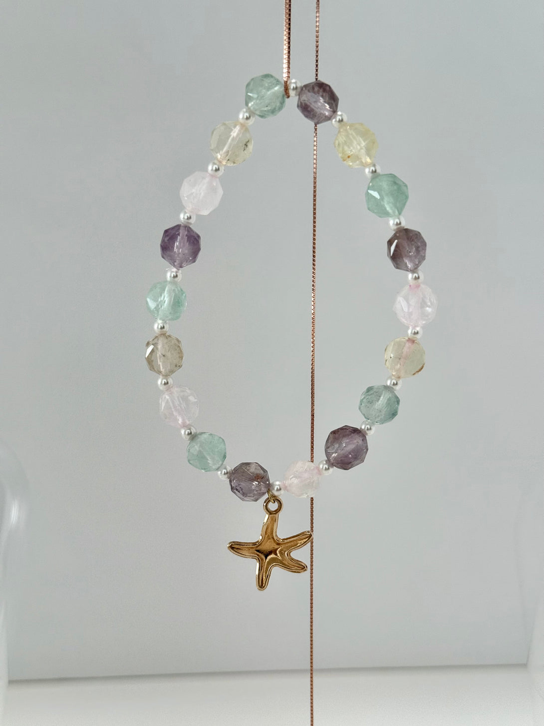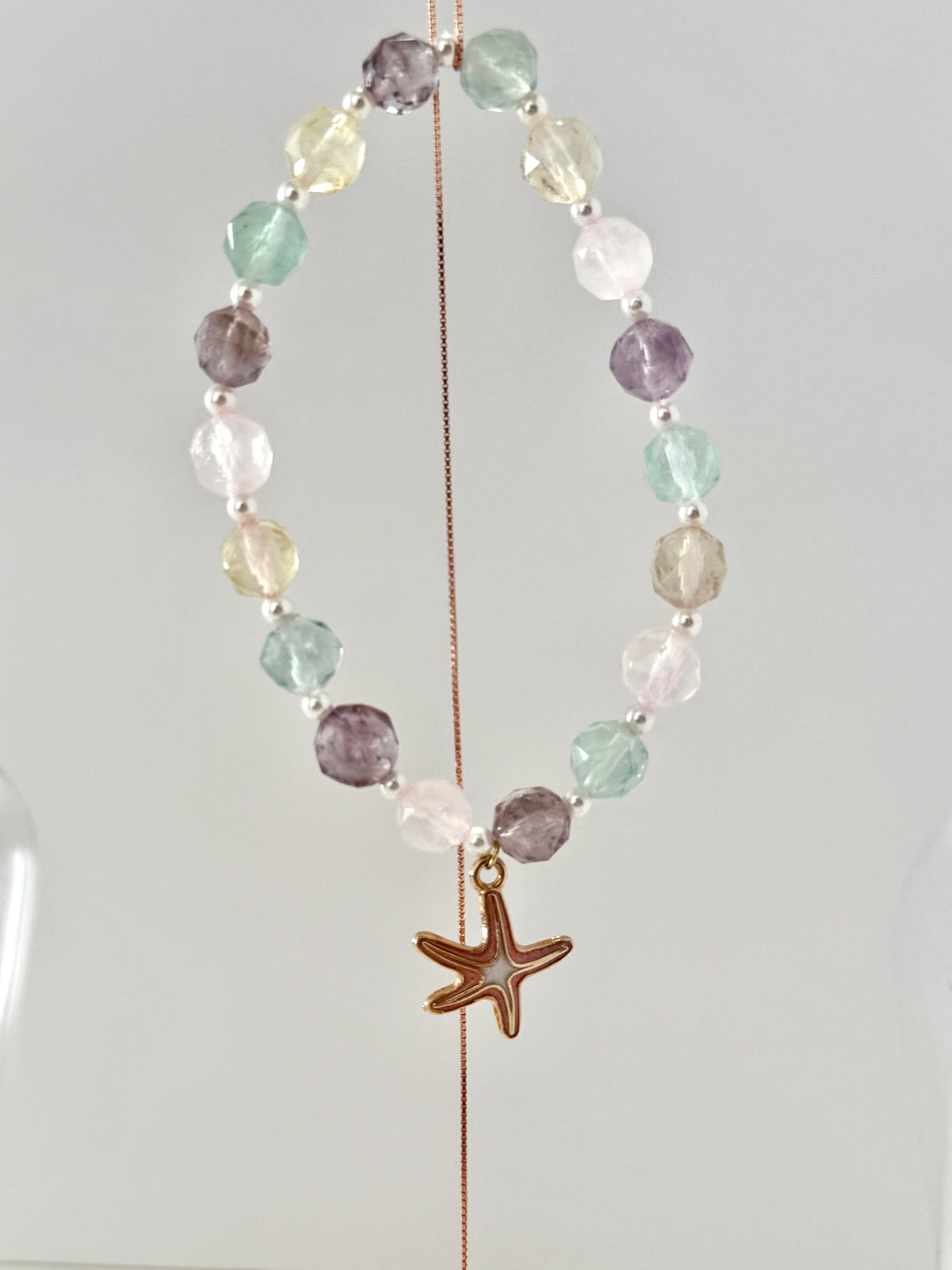Hand-strung with natural rainbow fluorite in soft pastel tones, this bracelet shimmers with delicate facets and a coastal-inspired starfish charm. Each stone is unique, creating a fresh, airy palette that pairs effortlessly with everyday looks or layered stacks.